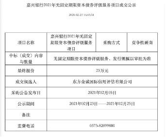 2月23日,嘉兴银行还公示了2021年无固定期限资本债券评级服务项目的成交情况。信息显示,东方金诚国际信用评估有限公司以25万元的价格中标。