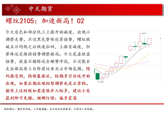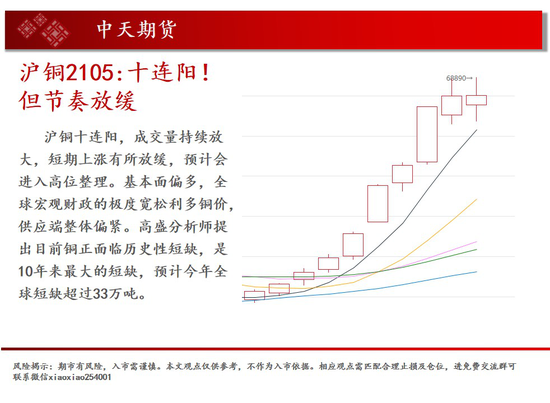 操作建议:沪铜十连阳,成交量持续放大,短期上涨有所放缓,预计会进入高位整理。多单建议保护位上移,后期建议下方支撑位重点关注五日均线附近,弱势一些的沪锌已经开始回调了,不过铜是龙头和强品,调整节奏和幅度可能会滞后和小些,中期建议看多不变。