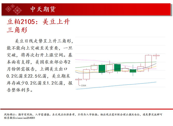 基本面概述:基本面有支撑,美国农业部公布2月份供需报告,上调美豆出口0.2亿蒲至22.5亿蒲,美豆期末库存减少0.2亿蒲至1.2亿蒲,报告整体利多。