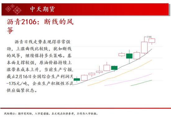 操作建议:沥青日线走势表现得非常强劲,上涨曲线比较陡,犹如断线的风筝,继续保持多头策略。