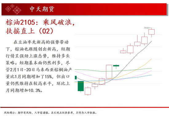 基本面概述:短期基本面仍然利多,尽管2月1日-20日马来西亚棕榈油产量比1月同期增加了15%,但出口量仍然维持在较高水平,环比上月同期增加10.3%。