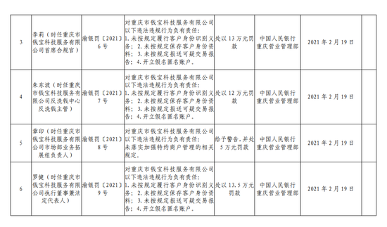 2月24日消息,人民银行重庆营业管理部公布的行政处罚信息公示表显示,重庆市钱宝科技服务有限公司因涉及未落实加强特约商户管理的相关规定、开立假名匿名账户等10项违法违规行为,受到警告处分并被罚款868万。同时,时任重庆市钱宝科技服务有限公司副总经理戚俊、首席合规官李莉等五位上述违法违规行为的相关责任人一并被罚,受到警告处分并被罚款5-13.5万元不等。