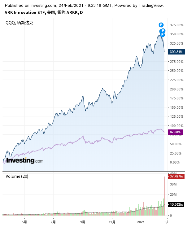 这就是为什么ARKK最近高位回落11%、伍德“警告”市场会出现恐慌、又大举抄底特斯拉等一言一行、一举一动都牵引着美股投资者神经的原因。