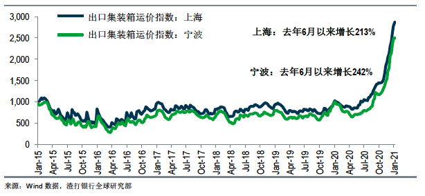 相比人民币升值,疫情期间国际海运运力不足可能是影响中国出口企业利润率的更重要因素。国家统计局数据显示,今年1月份PMI新订单指数为52.3%,虽已连续两个月回落,但继续高于临界点,处于近年来的高位,意味着中国出口有望保持强劲。“去年12月份,中国出口达到2819亿美元的历史峰值,但紧缺的海运运力或将在近期持续制约出口增长。”渣打银行中国宏观策略主管刘洁指出。去年12月初以来,全国出口集装箱运价指数已上涨55%;与此同时,去年6月以来,上海港和宁波港出口集装箱运价涨幅超200%。