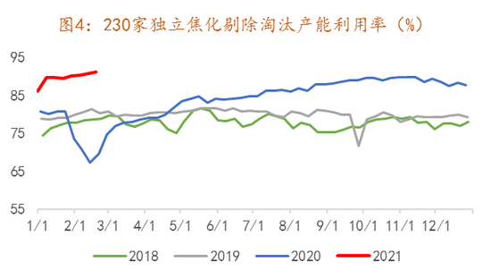 目前焦炭利润超1000元/吨,焦企整体开工保持高位,截至2月18日Mysteel统计独立焦企全样本:剔除淘汰产能的利用率为90.71%,环比上周增0.79%;日均产量74.92万吨,增0.65万吨。全国230家独立焦企样本:剔除淘汰产能的利用率为91.19%,环比上周增1.10%;日均产量64.98万吨,增0.72万吨。