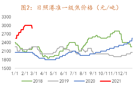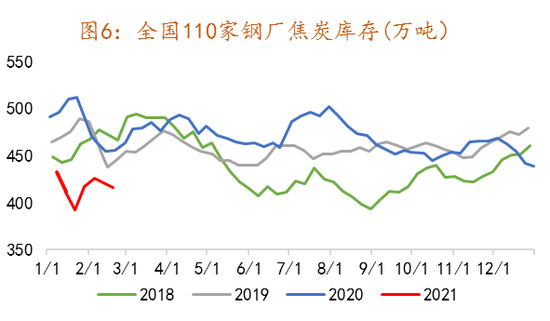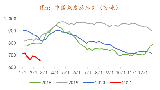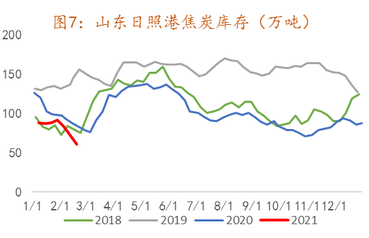 2020年淘汰焦化产能叠加下游需求旺盛,国内整体焦炭库存处于持续去库阶段,整体库存水平偏低。钢厂方面,钢厂焦炭库存处于低位,虽近期有一定好转,但考虑到焦化仍有去产能可能,钢厂高炉开工逐步恢复等原因,钢厂虽适度控制焦炭采购节奏,但不会过度降低原料焦炭库存。焦企方面,焦企焦炭库存由于春节运输影响,山西、西北部分焦企场内有一定库存堆积。港口方面,贸易商仍处于观望状态,去产能情况现在暂时不确定,若去产能严格执行,焦炭降价空间有限,可操作空间也有限。