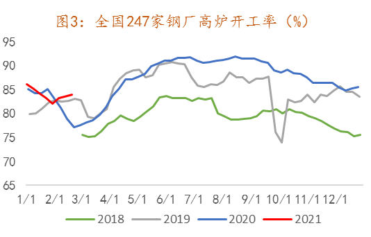 钢厂高炉开工逐步恢复。一方面,假期结束,务工人员返城,终端钢材需求逐步启动;另一方面2020年底钢厂由于疫情影响原料紧张,部分钢厂提前检修,节后或提前恢复正常生产。截至2月19日,Mysteel调研247家钢厂高炉开工率83.98%,环比上周增加0.78%,同比去年同期增加6.90%;高炉炼铁产能利用率92.19%,环比增加1.25%,同比增加12.09%;钢厂盈利率77.06%,环比增加1.30%,同比降9.96%;日均铁水产量245.38万吨,环比增3.32万吨,同比增加32.19万吨。