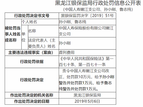第一财经记者注意到,2019年黑龙江银保监局曾发布过一则行政处罚信息,处罚的正是中国人寿嫩江支公司及其主要负责人孙小刚、鲁志纯,由于虚列费用,中国人寿嫩江支公司被责令改正,并罚款10万元,而两名主要负责人也被分别给予警告及罚款1万元的处罚。