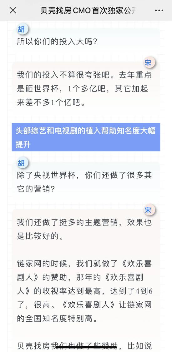 与此同时,贝壳在宣传风格上全面向互联网大厂对标,赞助“奇葩说”、“乐队的夏天”、“脱口秀”、“东京奥运会”等大型娱乐节目和赛事,投入千万甚至亿级的市场广告费用,具体费用在多少,我们不妨看看贝壳找房CMO宋琦此前在接受媒体采访谈到的数额。
