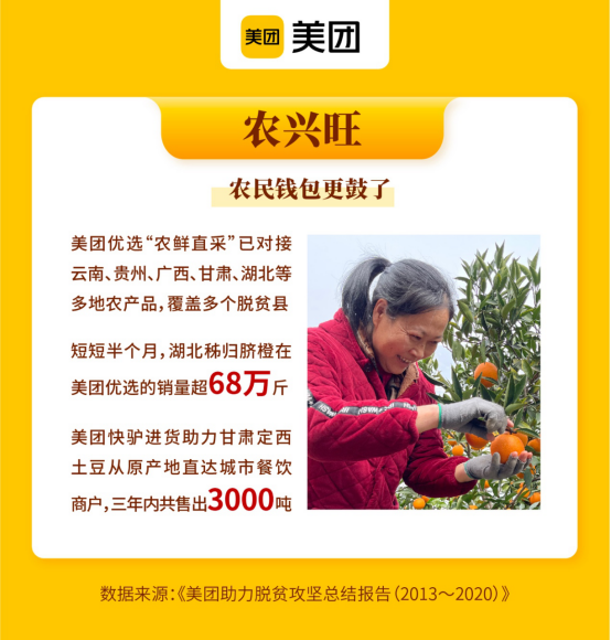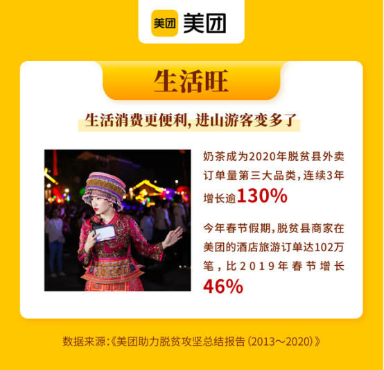 《美团助力脱贫攻坚总结报告》数据显示,2020年全年,全国已脱贫县商户在美团产生了约7亿笔订单、交易金额达到348亿,分别同比增长27%和22%,覆盖餐饮、景区、酒店、民宿和农家乐等多个品类。