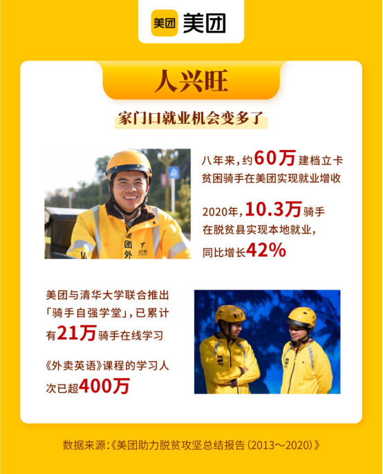 通过生活服务业数字化加速发展,这些脱贫县的外卖骑手等生活服务业就业岗位也不断增加。根据美团数据,2020年,在脱贫县获得收入的骑手达到10.3万人,同比增长42%。