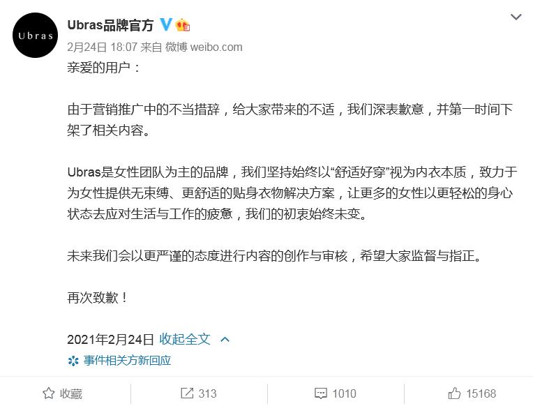 2月24日,知名脱口秀演员李诞在社交平台为Ubras品牌女性内衣带货,其宣传语中的“让女性轻松躺赢职场”引发网友质疑。李诞随后删除了该条推广内容。当晚,Ubras品牌在其官方微博发布致歉声明称,对于营销推广中的不当措辞深表歉意,已第一时间下架相关内容。