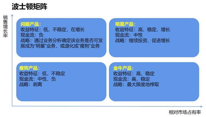 50年前,美国著名管理学家、波士顿咨询公司创始人布鲁斯·亨德森于1970年首创了用以分析和规划企业产品组合的分析法——波士顿矩阵。波士顿矩阵下决定产品结构的基本因素有两个:市场引力与企业实力。市场引力包括整个市场的销售量(额)增长率、竞争对手强弱及利润高低等,主要在于市场存在的潜在空间。企业实力包括市场占有率,主要在于企业本身的技术、设备、资金利用能力等,其中市场占有率是决定企业产品结构的内在要素。两者相互作用,影响着企业产品发展前景。