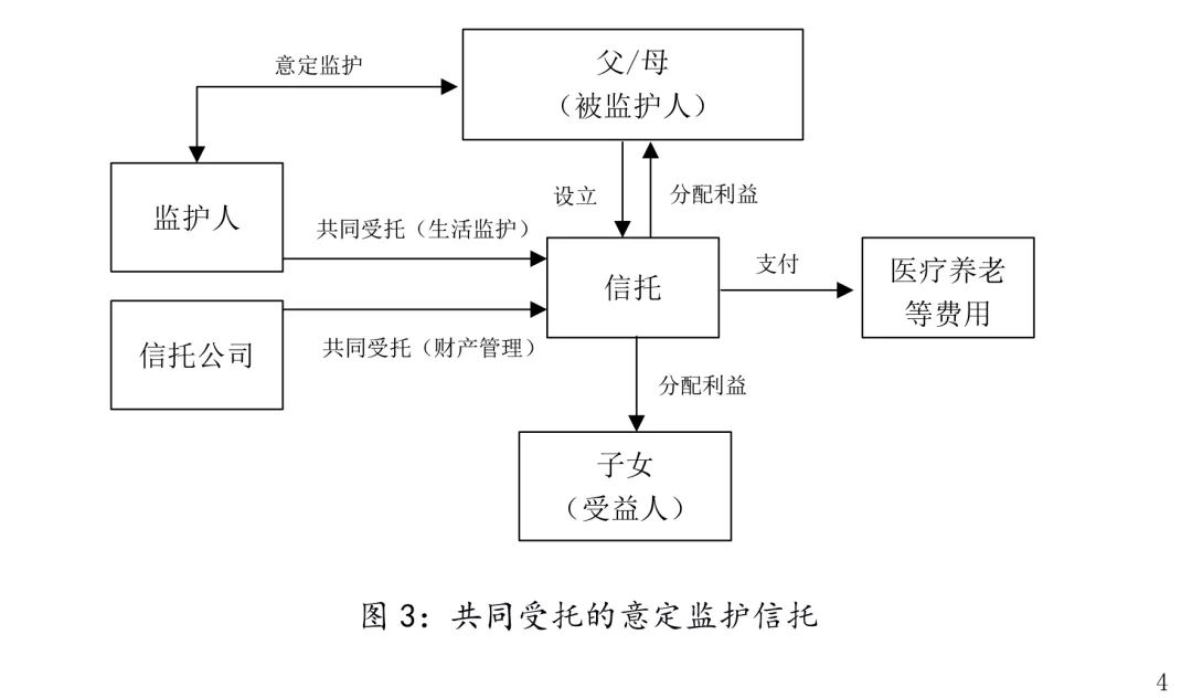 由意定监护人和信托公司共同担任受托人,接受委托设立意定监护信托,是将监护制度与信托制度更加紧密结合的一种方式。意定监护人和信托公司进行专业分工,意定监护人更加了解被监护人的生活需求和支出需要,负责被监护人的日常监护相关安排;信托公司则在投资管理和信托架构设计方面具有专业能力,有利于保障信托财产保值增值和信托利益合理分配。由于共同受托人对另一方处理信托事务承担连带赔偿责任,通过共同受托安排,还可以达到互相监督的作用,防止费用不当支付、显失公允交易发生等情形,有效防止监护权的滥用和信托财产的不当处分,从而更好地保护被监护人人身安全和财产安全。