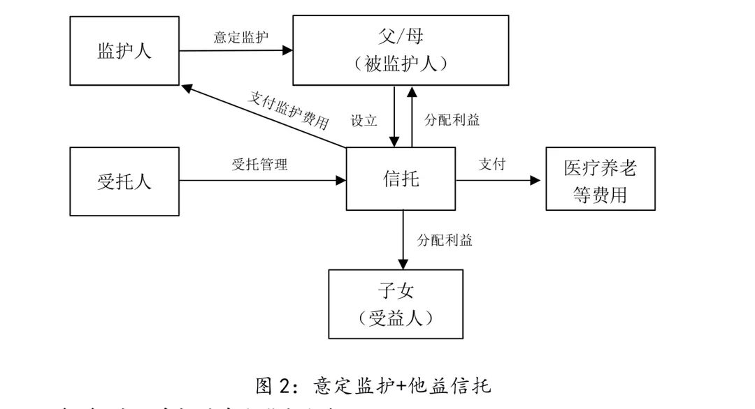 独居父母因子女智障、残疾等原因无法获得照顾的,可在设立意定监护的同时,将自身财产委托给信托公司设立他益信托,以自身养老和财产传承为目的,以子女作为信托受益人,不仅能够在自己出现特殊情形时保障自身权益,也为子女权益保障做出长远安排。当委托人丧失或者部分丧失民事行为能力时,意定监护关系生效,委托人得到意定监护人日常监护。信托受托人则根据信托合同约定和实际需要支付相应监护费用及其他养老费用,并向子女分配信托利益。而当委托人去世时,虽然意定监护关系终止,但信托依旧存续,将继续按照信托文件约定向作为受益人的子女分配信托利益。这样的安排,可以有效防止父母去世后,大笔遗产被子女继承后浪费挥霍,或被子女的监护人不当利用和恶意处分,长远地保障了子女生活支出需要。