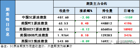 【1】WTI主力原油期货收涨0.25美元,涨幅0.4%,报63.53美元/桶;布伦特主力原油期货收跌0.08美元,跌幅0.12%,报66.11美元/桶;INE原油期货收跌2%,报407.6元。