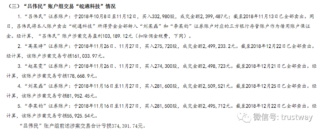 随后,吕伟民利用其本人的账户在10月末至11月初共计买入240万元,并于11月13日前全部卖出,获利10万元。利用上述4个他人账户,在11月分批合计买入1000万元,并于12月末全部卖出,亏损47万元。