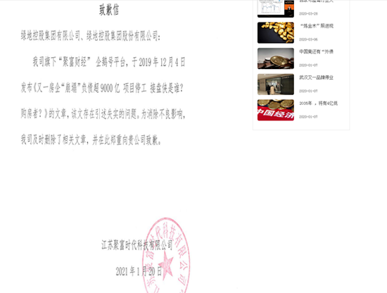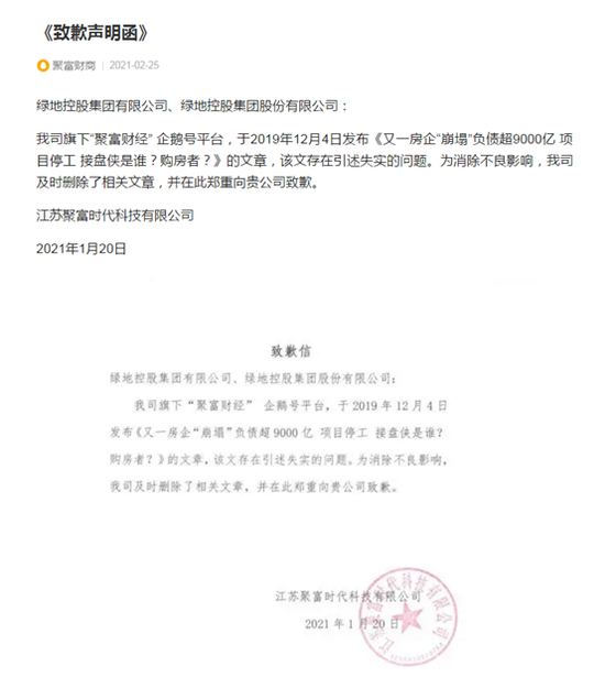 2月25日,江苏聚富时代科技有限公司通过其主办的“聚富财经”网站和腾讯企鹅号“聚福财商”等公开平台,因失实报道并侵权,向绿地集团公开致歉。致歉信显示: