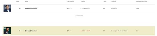 福布斯实时富豪榜显示,农夫山泉创始人钟睒睒不再是亚洲首富,被印度信实工业集团董事长穆克什·安巴尼(Mukesh Ambani)反超。
