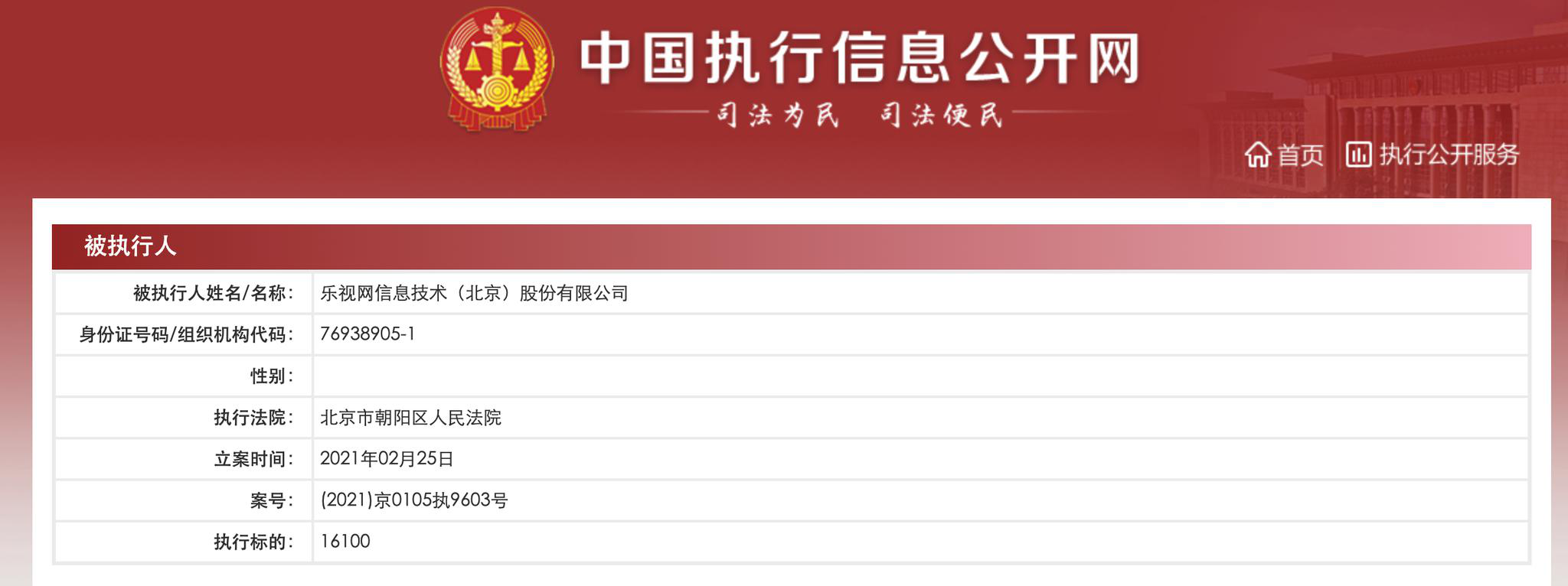 中国执行信息公开网2月26日消息,2月25日,乐视网信息技术(北京)股份有限公司新增2条被执行人信息,案号分别为(2021)京0105执9603号、(2021)京0105执9604号,执行法院均为北京市朝阳区人民法院,案件标的分别为16100元和215652元。