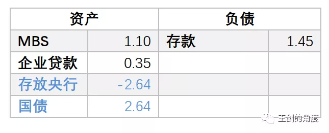 (2)银行购买国债2.64万亿美元,动用的是存放央行的准备金。这一步不涉及存款。