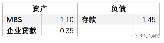 资产这边,贷款投放了0.35万亿美元,然后国债、MBS、其他证券分别购买了0.28万亿美元、0.48万亿美元、0.12万亿美元。最后,这银行还囤了1.48万亿美元的现金(也就是存放央行,跟上面美联储的报表能对上)。也就是说,他们投放了工商企业贷款仅0.35万亿美元(当然还有些ABS出去的部分,在证券中),其余的就是投放住房按揭贷款和国债,最后囤了一堆现金。当然,他们可能会说,满足老百姓合理住房需求也是支持实体,把钱给政府让政府去支持实体,这也是间接支持了实体。这话好像也没毛病。