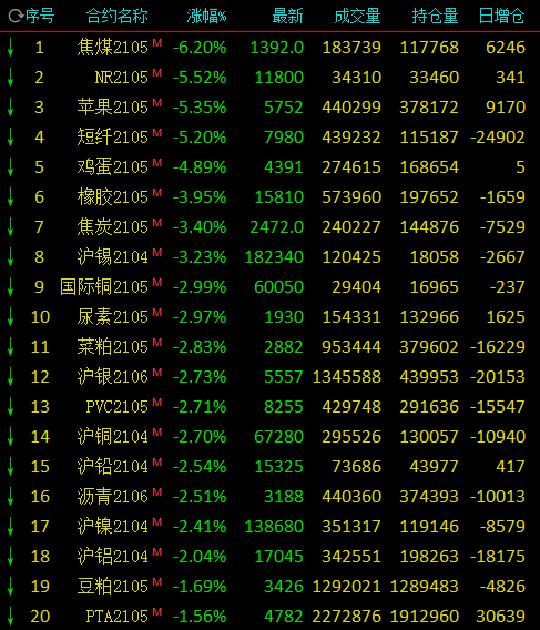 热点栏目3月1日,国内商品期市早盘多数品种下跌,焦煤跌超6%,焦炭跌超3%;化工品涨跌互现,20号胶、短纤跌超5%,纯碱涨近3%;油脂油料多数上涨,花生、豆油涨超3%;其他农副产品多数下跌,苹果跌超5%,鸡蛋近5%;贵金属走跌,沪银跌近3%,沪金跌超1%;基本金属普跌,沪铜、沪铅、沪镍跌超2%。