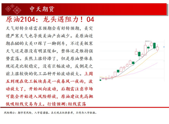 操作建议:上周五到现在化工板块真是一夜春风一夜雨,波动放大了,开始双向波动,后期需注意市场可能会开始进入风险释放,原油建议先高抛低吸短线交易为主。行情预测:短线震荡