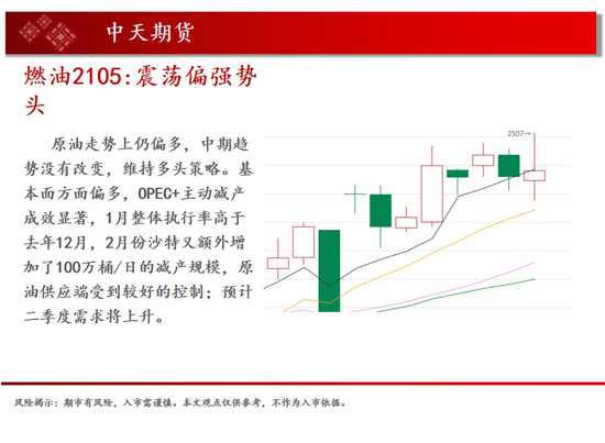 基本面概述:基本面方面偏多,OPEC+主动减产成效显著,1月整体执行率高于去年12月,2月份沙特又额外增加了100万桶/日的减产规模,原油供应端受到较好的控制;预计二季度需求将上升。