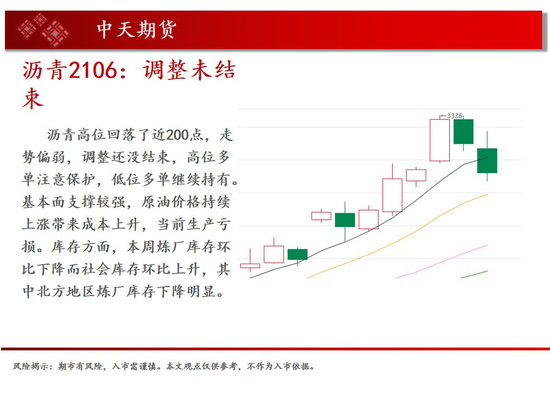 操作建议:沥青高位回落了近200点,走势偏弱,调整还没结束,高位多单注意保护,低位多单继续持有。