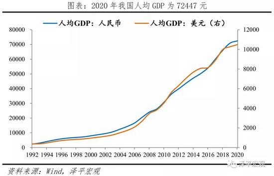 预计2020年中国人均GDP为72447元,较上年名义增长2.2%;人均GNI(国民总收入)为71960元。以美元计价,我国2020年人均GDP为10450美元,人均GNI为10429美元,处于中等偏上收入经济体行列。