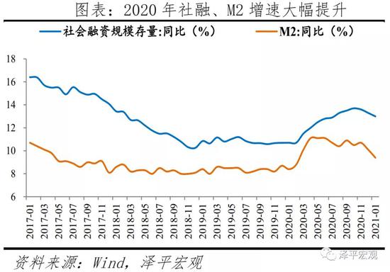 为应对疫情冲击,2020年货币财政政策大幅宽松,宽货币与宽财政轮动,带动社融、M2增速大幅上涨,宏观杠杆率明显抬升。2020年末广义货币供应量(M2)余额218.7万亿元,增长10.1%;全年新增社会融资规模34.9万亿元,按可比口径计算,较上年大幅多增9.2万亿元;年末社会融资规模存量284.8万亿元,增长13.3%。年末金融机构人民币贷款余额172.7万亿元,同比增长12.8%。截至2020年末,实体经济杠杆率270.1%,较2019年末大幅提高23.6个百分点。其中,居民、非金融企业和政府部门杠杆率分别为62.2%、162.3%和45.6%,较2019年末分别提高6.1、10.4和7.1个百分点。