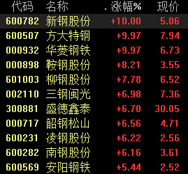 周三盘中,钢铁板块持续走强,截至发稿,新钢股份、华菱钢铁、方大特钢拉升涨停,韶钢松山、鞍钢股份、柳钢股份、三钢闽光等跟涨。
