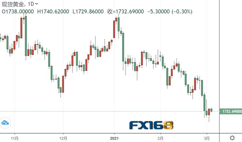 FX168财经报社(香港)讯 周三(3月3日)亚市盘中,市场交投较为平静,美元延续昨日自三周高位下跌的势头,现货黄金回吐昨日部分涨幅,目前交投在1730美元附近。