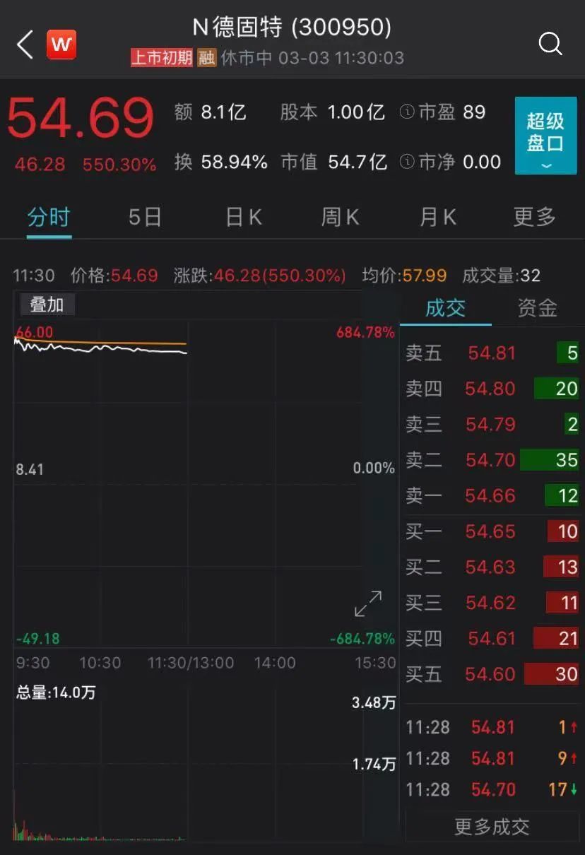 此外,德固特今日登陆创业板,发行价8.41元,上午最高涨至66元,最高涨超600%。截至午间收盘,N德固特大涨约550%,报54.69元,中一签约可赚2.3万元。