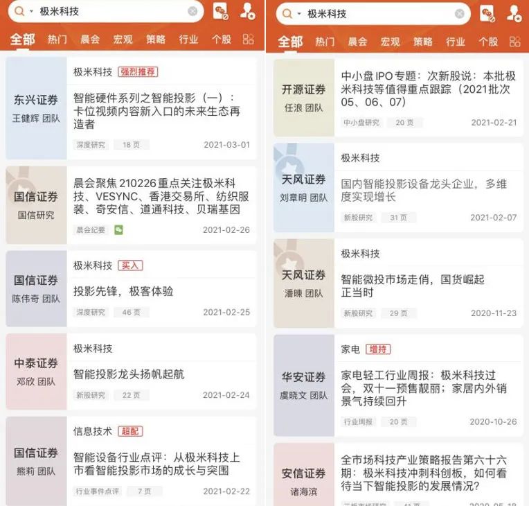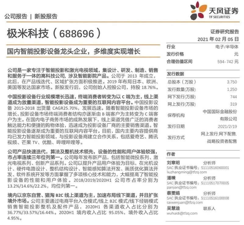 值得一提的是,在注册制时代股票数量增多的背景下,许多新股上市半年也无机构问津,而今日亮相的极米科技堪称“明星公司”,在上市之前就受到了诸多机构的关注,包括国信证券、东兴证券、天风证券、中泰证券等研究机构都明确表示看好。