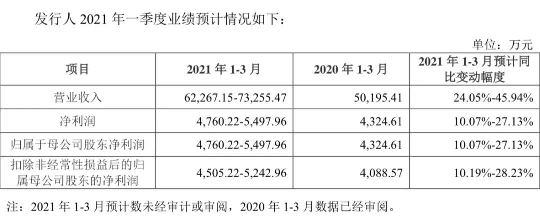 同时公司在上市公告书中披露,预计2021年第一季度营收约6.23亿元至7.33亿元,同比增长24%至46%;预计一季度归母净利润达到4760万元至5498万元,同比增长10%至27%。