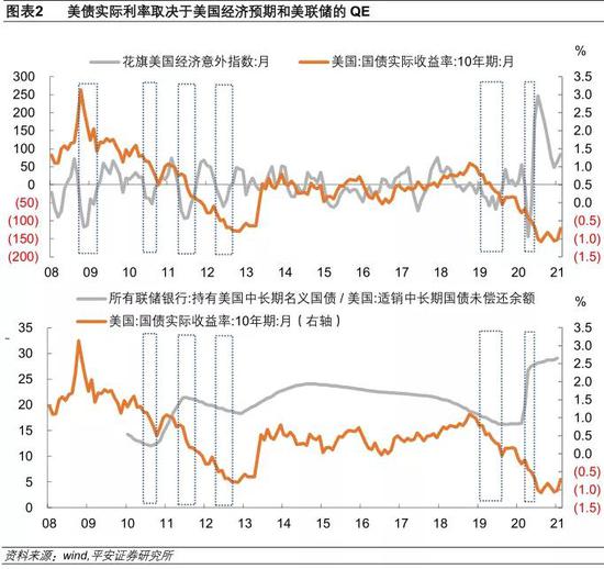 之所以这么说,是因为美联储开放式QE是2020年美债实际利率显著为负的关键所在。我们认为,美债实际收益率的影响因素主要在于两方面:一是市场对经济增长的预期。考察2008年以来10年美债实际利率与花旗美国经济意外指数的关联,可以发现当经济意外指数持续为负时(意味着经济表现弱于市场预期),往往对应美债实际利率大幅下行。这在2008年到2013年,以及2019年到2020上半年实际利率趋势下行的过程中,均有突出体现(图表2上)。二是美联储的国债购买行为。考察2010年以来美联储持有的中长期国债占美国存量适销中长期国债的比例,可见2010年四季度到2011年上半年,美联储持有中长期国债占比从12%提升到21%,此后稳定在20%平台附近,在此阶段叠加美国经济增长疲软,10年美债实际利率大幅下行至-0.8%左右的历史低位。2020年以来的情况与彼时相近,新冠疫情影响下,美联储持有中长期国债占比从2月的16.4%骤增至7月28.2%,2021年1月进一步增至29%。如此大规模的量化宽松举措下,尽管2020年6月以来美国经济预期就显著转好,但美联储购债仍致使美债实际利率进一步探底至-1%左右(图表2下)。