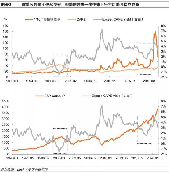 一是,目前美债收益率仍处于很低的水平,对股市估值还有较好支撑性。历史上,当经周期调整的Shiller PE超出长期美债收益率的倒数(可理解为债券的PE)时,均预示美股的大级别调整,包括1929年、1969年、2001年、2018年。2020年美联储重启降息+量宽之后,长期美债收益率的倒数大幅蹿升,按照2月26日10年美债收益率1.44%计算,在本轮美债收益率快速调整之后,其倒数明显下降,但仍然处于近年来高位,对美股在相对估值上的支持尚不弱。按照Shiller计算的Excess CAPE Yield,目前美股相对美债的实际超额收益仍有3.1%,处于2008年以来的波动中枢附近,美股依然拥有良好的性价比(图表3上)。随着美国经济复苏的展开,美股盈利将逐渐消化美股估值,美股对利率温和上行的承受力也会有所增强。