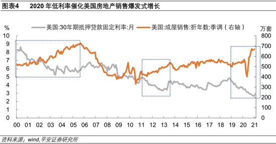 二是,美国房地产销售已接近触顶,对实际利率上行的敏感度下降。首先需要指出,房地产在美国经济中的占比不像中国这么高,2019年占比在12.2%,房地产景气度对于美联储货币政策的约束远不及股票市场。2020年美联储快速降息,带动美国抵押贷款固定利率降至2.66%的历史低位,叠加新冠疫情导致购房需求上升,触发了美国房地产销售的爆发式增长。截至2021年1月,美国成屋销量接近于2006年达到的高峰(图表4)。