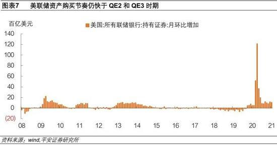其次,美国经济复苏推动实际利率上行,但美联储QE购买决定实际利率上行的节奏。随着新冠疫苗如期推广、疫情切实好转,加之财政政策加码和房地产投资上行,2021年美国经济复苏具有较高确定性,从而实际利率保持有上行驱动。但去年以来美联储QE资产购买规模巨大,目前仍然保持每月800亿美元国债和400亿美元MBS的购买操作,并承诺持续到“在实现最大就业和价格稳定目标方面取得实质性进展”。这个购买规模尽管比去年大大减小了,但仍然高于QE2和QE3的购买速度(当然这也是由美国国债发行量上升所决定的,体现了货币对财政政策的配合),美联储所持有的存量中长期美国国债占比也在持续上升(图表7)。简言之,美联储QE购买仍将对美债实际利率保持压制。