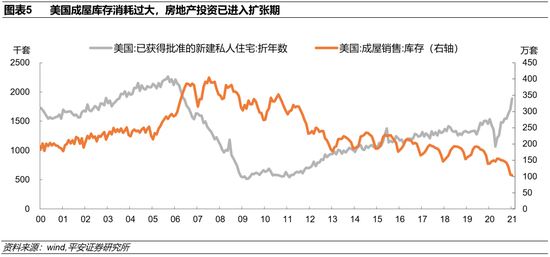 不过,2020年房地产销售骤增,对成屋库存的消耗较大,2020年1月成屋库存在140万套,到2021年1月下降到104万套,创历史新低。目前美国成屋库存水平已经不支持房地产销售继续保持高位。2021年美国开始进入房地产投资上行周期,2021年1月获得批准的新建私人住宅年化值达到188.6万套,比2020年1月增长22.8%,也在向2006年的高峰靠拢(图表5)。在此情况下,美国房地产行业对整个产业链的拉动将有韧性,而利率温和上行对房地产销售的影响不是主要矛盾。