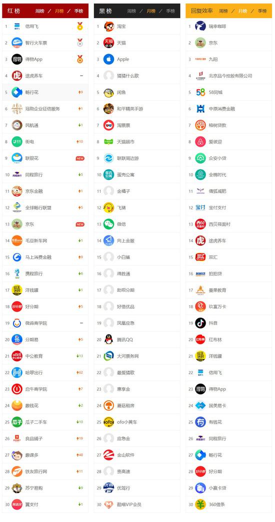 红榜:信用飞、畅行花、冠勋企业征信服务、联银花、京东金融、马上消费金融、洋钱罐、好分期、分期易、趣钱花