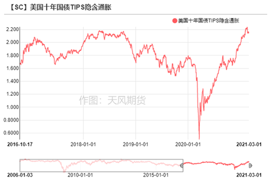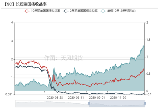 美国十年国债TIP隐含通胀已经突破2%的阖值,通胀预期达到历史高值,长短端利差走阔。