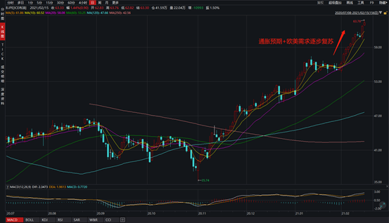 在通胀预期快速上行的时期,原油的金融属性放大,由宏观刺激主导涨势。布伦特在基本面和通胀预期的双重作用下快速拉升,2月整体涨幅超过18%。