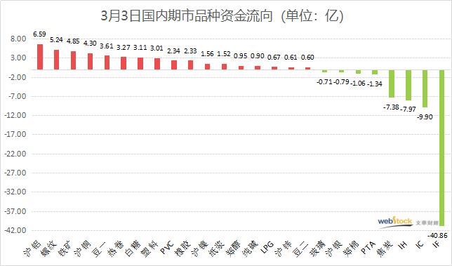 资金流向方面,文华商品指数流入资金34.64亿元。钢材板块全线飙升,获得13.35亿资金热捧,其中螺纹继续获得2.36万手增持,流入资金达5.24亿元,铁矿石也获得4.85亿资金热捧。有色板块亦流入资金达12.68亿元,其中大幅拉升的沪铝获得6.59亿资金加持。