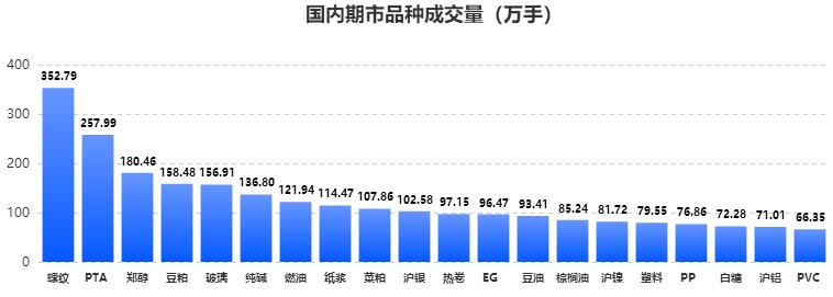 成交方面,期市交投继续小幅回落。螺纹强势拉升,成交量环比大增40%,跃至期市成交量排名之首,PTA、甲醇。豆粕紧随其后。鸡蛋、沪铝、PVC、热卷成交量环比增幅均超40%。成交额前三甲分别为IF、螺纹、沪铜。