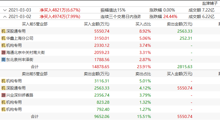 观察其前一日的龙虎榜数据,3月2日时,北向资金已开始大举加仓盐津铺子近3000万元,知名游资华鑫证券上海分公司亦杀入抢筹了2900万,又于今日卖出超3200万。