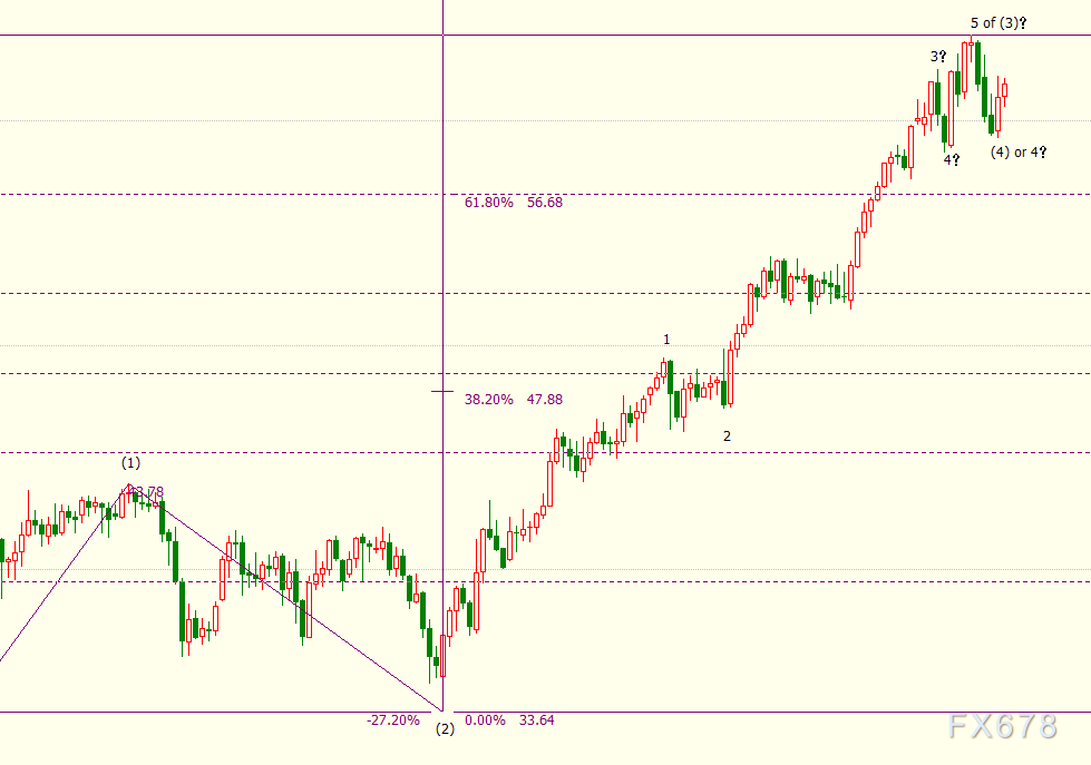 日线图上看,NYMEX原油可能已经在63.81美元结束(3)浪走势。若油价迎来(4)浪回调走势,下方近期支撑看向56.69美元,它是(3)浪(33.64美元-63.81美元)的23.6%斐波那契回档位。