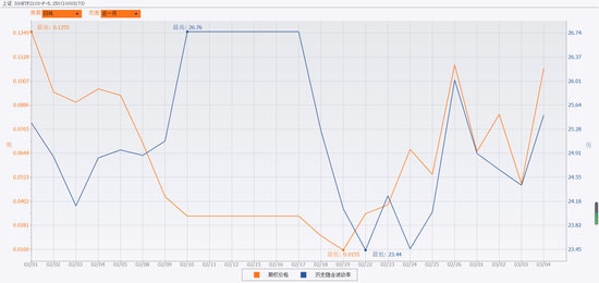 多个2103认沽期权的隐含波动率出现了小幅上涨,其中,行权价为5.25的50ETF2103认沽期权合约的隐含波动率为25.49%,较上一交易日上涨了1.07%。